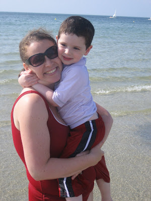 Grandma and Pa were already waiting for us at our rental house in Brewster. After lots of hugs and kisses and unpacking the car we all headed for the beach. It was low tide, the sand was soft and the water was warm. Seth got in and enjoyed right away. Justin even seemed to love the gentle waves and playing in the sand. We are still working on the lesson - do not eat sand!